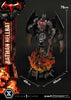 Prime 1 Studio proudly collaborated with renowned concept artist Josh Nizzi to extract the full might of this high-risk, unforgiving menace of a suit for this incredible Batman collectible statue. The exo-suit's surreal attack and evasive capabilities are evident in the energy-based broadsword and the large wings forming from its back. The helmet’s red eye visor and the chest insignia on the mechanical torso scream “Don’t mess with me.” Josh Nizzi also adds a touch of originality and depth by highlighting the muscle lines across the whole body with red lines, showcasing the overall flexibility and durability of the nano-kinetic metallic suit. Inspired by the planet Apokolips, the base is finely finished with embedded LEDs, creating illuminating flames and a metallic red bat symbol that guides you to the battleground.