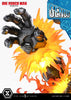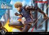 Genos' sculpt is intricately detailed, from the sculpted volume of his short hair to the rugged texture of his denim jacket and the solid metallic sheen of his cybernetic arms. His lean yet powerful physique is expressed with meticulous sculpting and paintwork, capturing every nuance of his form. Every element has been carefully crafted from the direction of his piercing yellow pupils to the powerful contours of his thighs as they tense mid-leap.